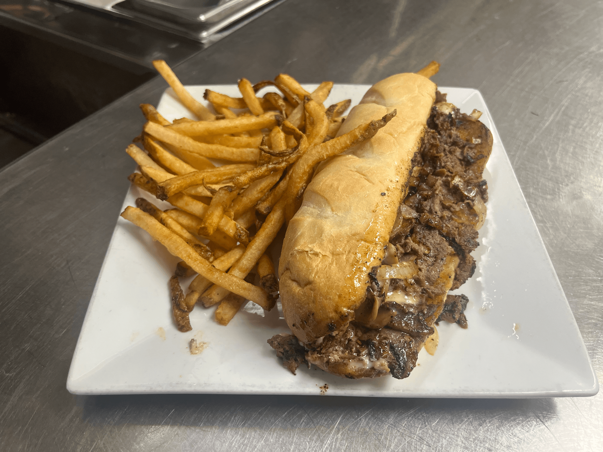 Sliced beef, mushrooms, peppers, onions, and cooper cheese on a hoagie roll