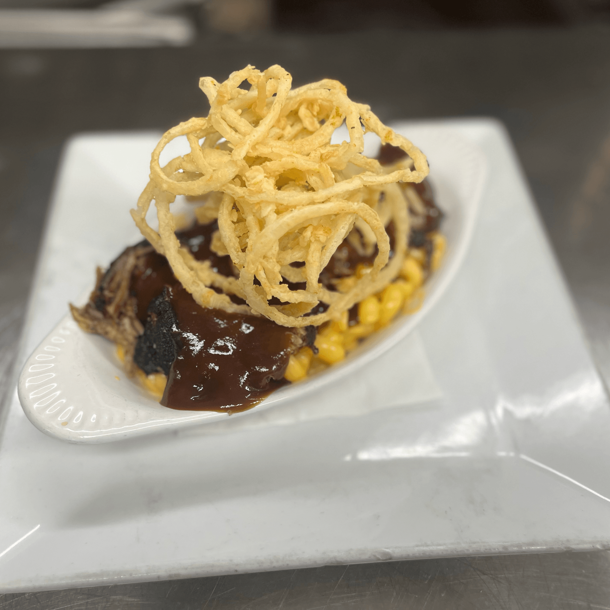 House made mac and cheese, smoked pork, bbq sauce, and crispy onion straws