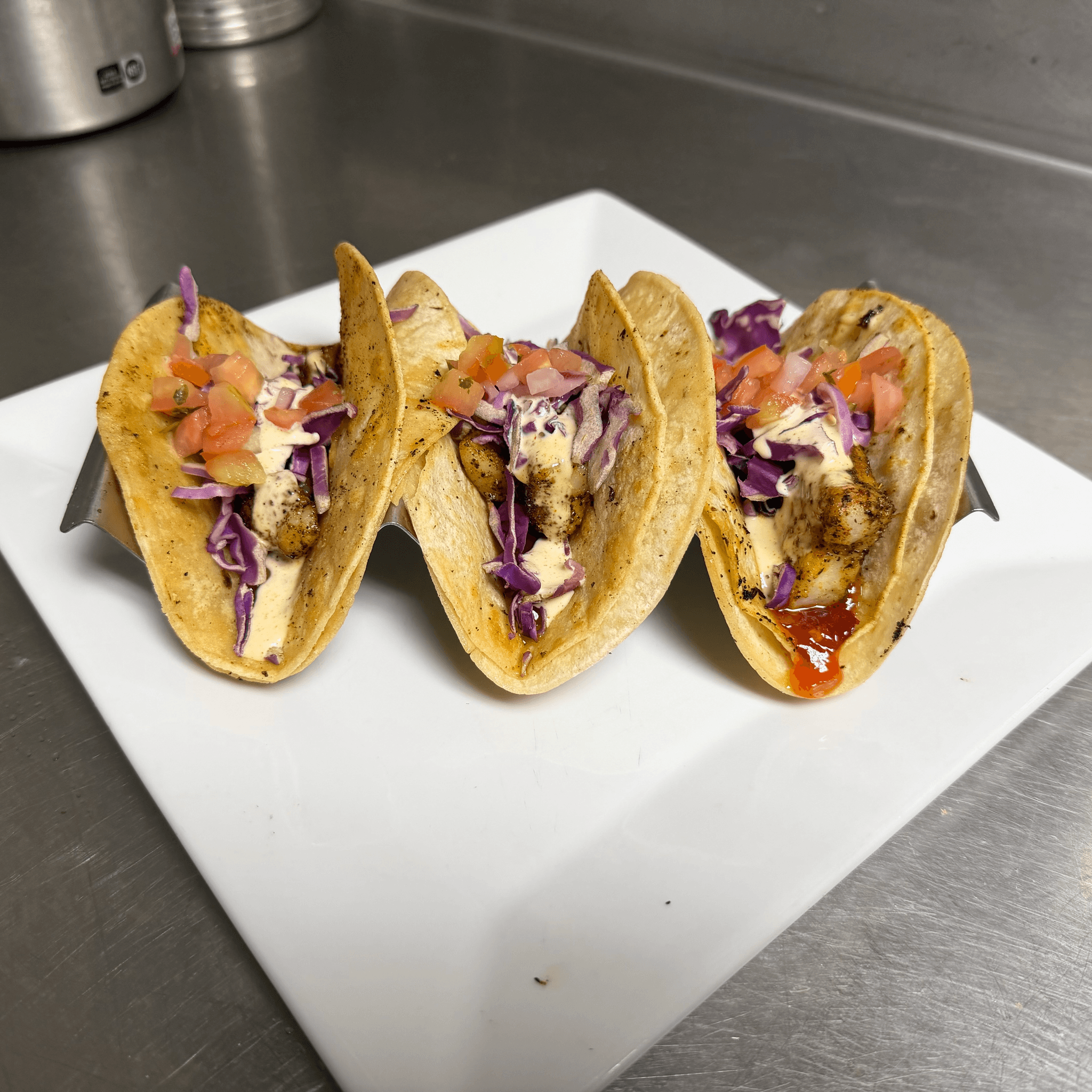 Corn tortillas filled with flakey white fish and topped with house sauces, cabbage, and pico