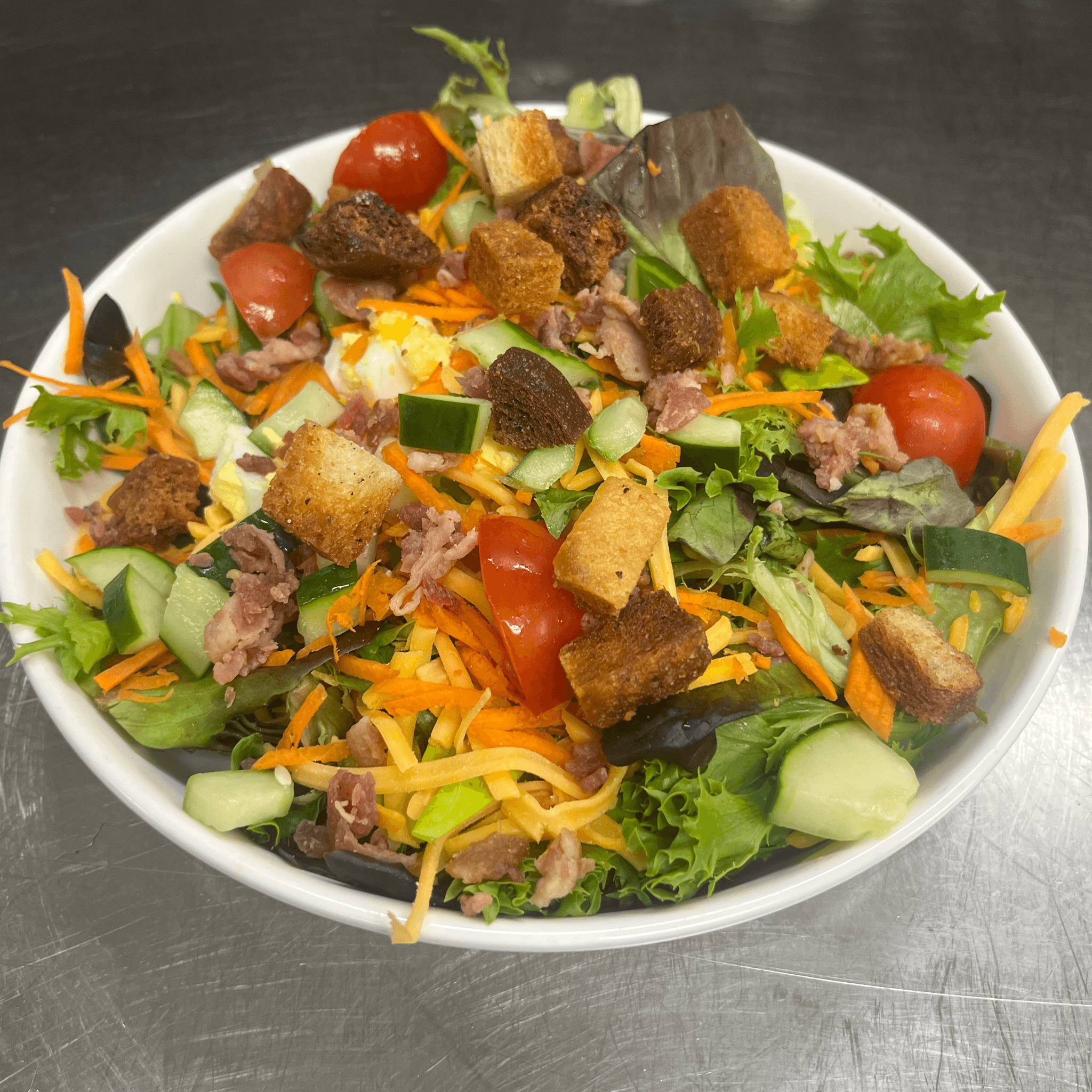 Mixed greens, cheddar, egg, bacon, carrots, cucumbers, tomatoes, and croutons.