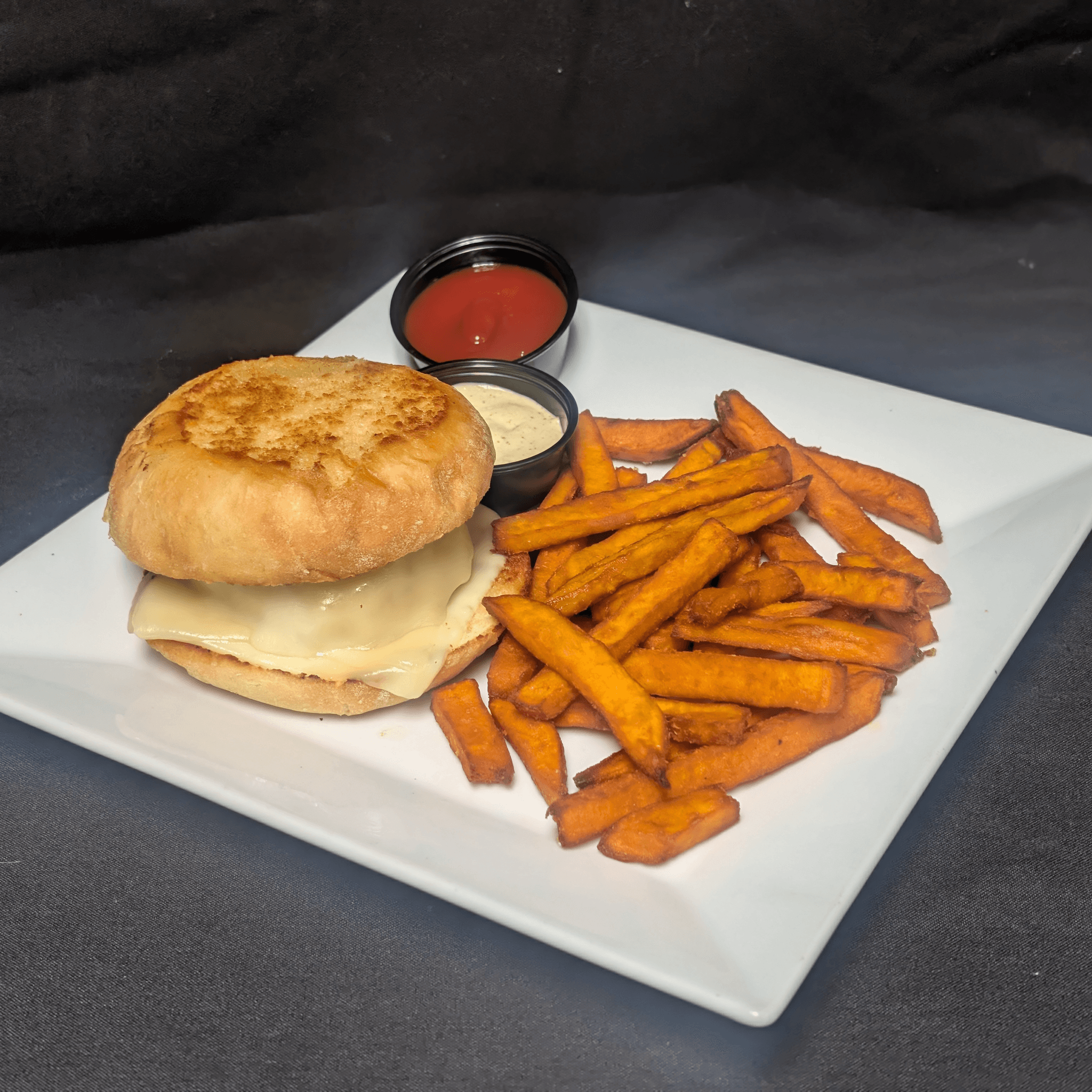 6oz grilled chicken breast on a potato roll with lettuce, tomato, grilled onion, mayo. make BBQ or Buffalo Blue