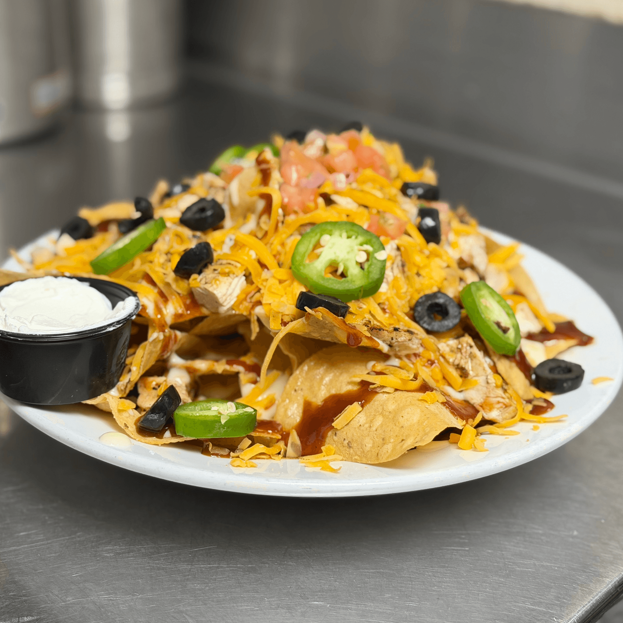 Corn tortillas, BBQ sauce, queso, cheddar, black olives, jalapenos, pico and sour cream